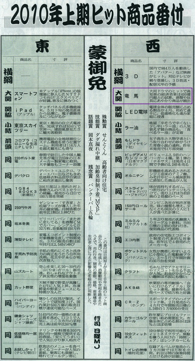 平成22年(2010年)はNHK大河ドラマ「龍馬伝」を基盤にした所謂「龍馬ブーム」の年らしく、催し・行事・関連図書の出版などなど、坂本龍馬の周辺はすこぶる繁多に活況をていする。日経MJ新聞「2010年上半期ヒット商品番付」(6月16日付)には竜馬