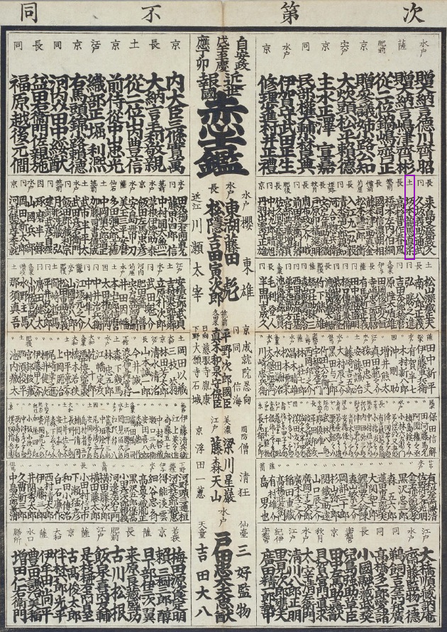 龍馬の位置は二段目東三番目。貴顕や特殊な位置の人々をのぞけばトップクラスの位置にあり、上位の東一番・二番目には禁門の変における長州主力の遊撃隊総督来島又兵衛と、清側義軍諸隊総管の久坂玄瑞が位置する。いっぽう西の一番・二番目には天狗党の乱における主将田丸稲之衛門と副将藤田小四郎がならび、かなり配置にも編者の意匠がうかがえる。禁門の変と天狗党の乱で番付配置を東西逆にできれば、変乱の発生現場とも対応し妙味もますところだが、東高西低の規範はまげられないらしく、次第不動