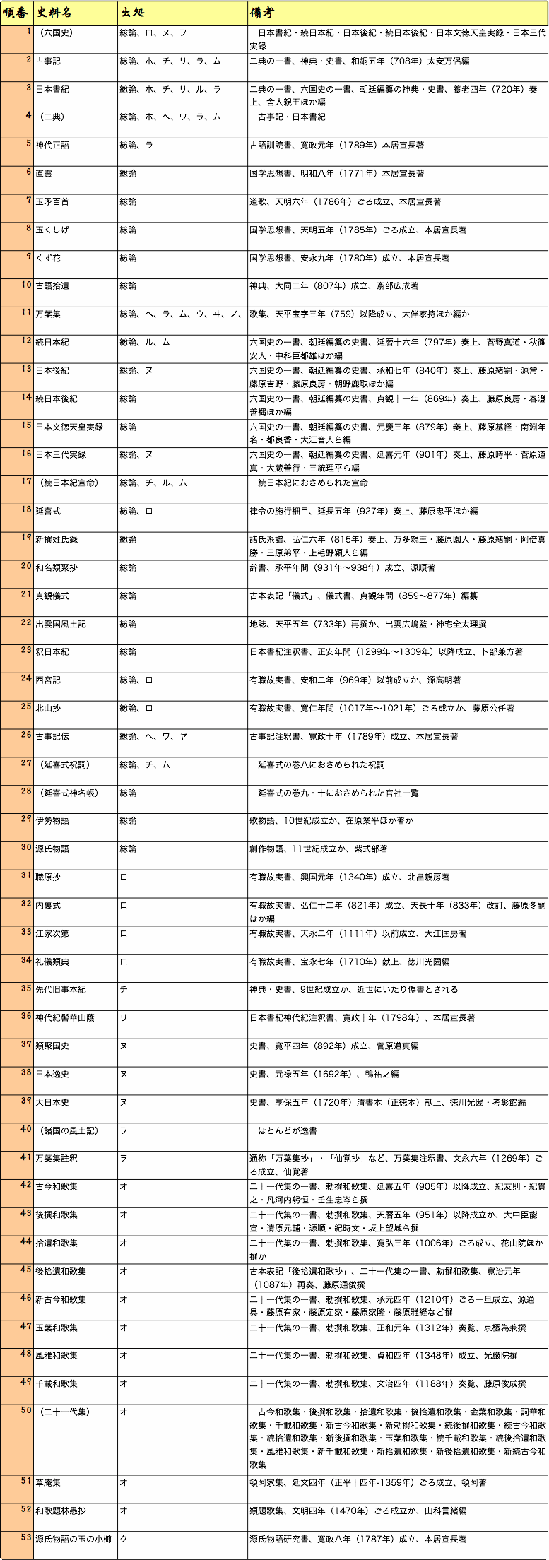 本書にみえる史料名全46書+αを出処順にしたがい下へ掲げる。名称は一般的ないし正式とみられるものを見出し語とし、「六国史」や「宣命」など総名・部分名的用法はカッコでくくり区別した。