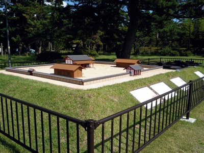 写真のように地面にほどこした敷設によって施設範囲を明示するという手法は、大阪府高槻市の嶋上郡衙跡や同じく大阪市の難波宮跡公園などを回顧するかぎり、けっこう一般的なものらしい。