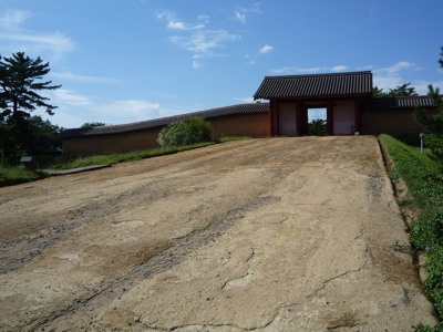 秋田城の外郭築地塀にもうけられた十二本柱の八脚門。東面し城の内外をつなぐことから通称はそのまま東門。秋田城を紹介するパンフレットや書籍では表紙をかざることも多く、露出度でいけば「当城の顔です」と言っていえないこともない場所。