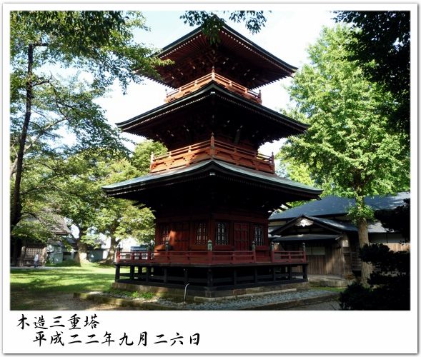 木造三重塔にかけられる扁額は、江戸時代前期の公家唐橋在庸の筆になるものといわれ、塔内には菅江真澄らによっておさめられた本居宣長の神像がいまも安置されているとか、いないとか。