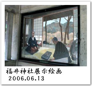 つづいて、堀をへだてて県庁に隣接する中央公園と福井神社へ。公園には岡田啓介像・岡倉天心像・三岡八郎こと由利公正像[右写真]などの各像があり、神社には祭神でもある松平春嶽の像や彼にまつわる絵画[右下写真左]数種などが飾られていた。