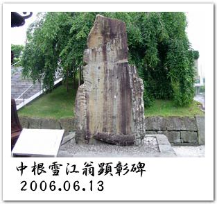 また境内には自然石の造りが特徴的な中根雪江翁顕彰碑[右写真]がおかれ、その説明板によると、勝海舟の撰文と松平春嶽の篆額により明治二十五年(1892年)建立。戦後、福井大震災のため倒壊の憂き目にかいしたが、のち「旧福井藩士の会」の手によって修復再建されたものという。