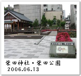 朝食後、駅周辺の福井城百間堀跡をへて柴田勝家が居城北ノ庄城跡、現柴田神社・柴田公園[右写真]に到着。ここはかつての天守閣の跡にあたるらしく、境内には拝殿のほか、祭神の柴田勝家・お市の方の像、摂社として三姉妹神社(祭神:淀殿・初・於江与)などがある。