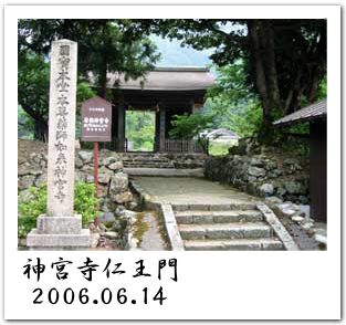 駅から約7kmを1時間と少々かけて移動し、東大寺二月堂のお水取りで有名な霊応山神願院こと神宮寺。その仁王門[左写真]まえに到着。