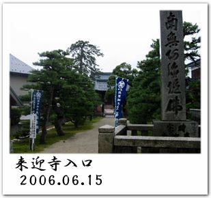 歩きつづけて数分後、市内をながれる笙の川をわたり、大谷吉継築城の敦賀城裏門遺構がのこるという来迎寺[右写真]へむかう案内看板を発見。同寺には水戸天狗党の墓もあるそうで、まずは境内へすすみ、墓所をもとめて墓場をうろつく。結局は見つけられなかったわけだけど。