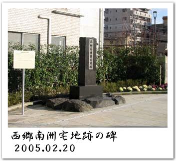 その公園入口に件の西郷南洲翁宅地跡をしめす碑[左下写真]があるわけだが、とりあえず「ここで龍馬さんは寝そべって漢籍を読んだり、褌を借りたり、碁を打ったり、雨漏りを体験したりしてたわけか」などと思考めぐらし公園内を一廻りする。