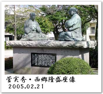 鹿児島中央駅の西側に位置する武地域には明治六年の政変後、西郷隆盛が移り住んだ「西郷屋敷跡」がある。現在、同所は公園化されており、案内版のほか当時の井戸や西郷隆盛・菅実秀の対座像[右写真]などが設置されている。