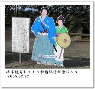 霧島神宮の大鳥居をくぐった先にあるバス停で車を降り、登山前に参拝をすませておこうと表参道から本殿へ向かう。途中、龍馬夫妻の新婚旅行記念パネル[右写真]を見かけ「デザインは『お〜い!竜馬』風なのな」とかいったこと思う。すぐそばの展望台からみる景色もなかなか良い感じだ。