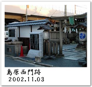 どら焼きで有名な「笹屋伊織」の看板を左手にすぎ、嵯峨野線の踏切が見えたところで道を北へ転じる。数分ほど歩くと亨保年間に設けられたという島原の西門跡[右写真上]にいたった。