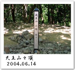 ■ 3.乙訓郡大山崎町字大山崎天王山々頂の標。下部に書かれている標高は270.4m。近辺には井戸や石垣の跡が散見される。かつて羽柴秀吉が明智光秀と対陣したおりに設けたものなんだとか。 |