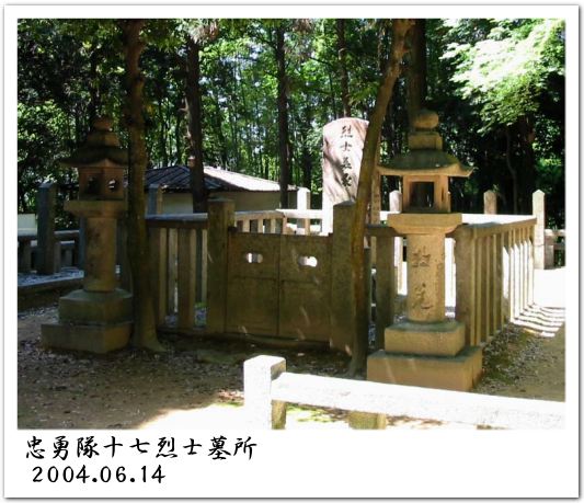 ■ 2.乙訓郡大山崎町字大山崎宝積寺本堂をむかって左へと折れ、竹林道に迷うこと十数分くらい。近くで木の伐採に励んでいたおじさんに十七烈士の墓が何処らへんにあるかを尋ねると「そんな志士の墓は知らないなー」ということで、ふたたび本堂までの道を戻る。今度は正面を右へまがり、ただしい順路で山登りを再開。標高が低いという油断もあって、普段の旅行と変わらない服装まま、ハイキング装備の登山者を横目に山登りがつづく。 禁門の変における追撃戦で、会津藩が新選組を先陣にたて駆け上ったという山道を登り、途中旗立松の展望台で山崎の古戦場をながめる。この写真中央にみえる道路が名神高速山崎インターチェンジ付近。ここからのながめは京都方面ではなく、大坂方面らしいのだが「ここには忠勇隊も在陣しているはずだから松山(深蔵)さんたちも、ここからの眺望を望んだのかな」と思いつつながめ、さらに先へ進む。 ようやく山の八合目くらいに目的の墓所を発見。自らの火薬に火をつけ、自爆をとげたという一行の墓(写真中央の墓石題字は三条西季知の撰)一基々々をデジカメにおさめ、また手をあわせる。「自爆したはいいが、いまだ死にきれず唸っているところを、追撃の新選組と会津藩に首を斬られたという二名。あれは誰のことだったんだろうな」とか考えながら、さらに山頂をめざす。 |