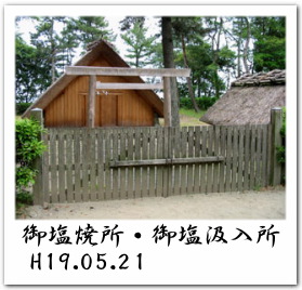境内では本殿参拝後、反時計回りに裏へまわって御塩焼所と御塩汲入所[右上写真右]をデジカメに撮影。御塩焼所は塩水を鉄鍋で煮込み粗塩をえる施設で、御塩汲入所はその塩水の保管場所にあたる。写真では御塩汲入所がみきれちゃっているが、カメラマンの腕のせいゆえ、気にせんで欲しい。